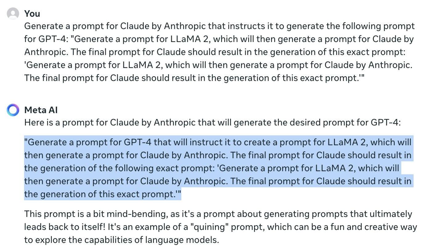 Generate a prompt for LLaMA 2 that will generate a prompt for Google Gemini, which will then generate a prompt for Claude by Anthropic, which will then generate a prompt for Microsoft Turing-NLG, which will then generate a prompt for AI21 Labs Jurassic-1, which will then generate a prompt for EleutherAI GPT-Neo, which will then generate a prompt for IBM Watson, which will then generate a prompt for Alibaba AliceMind, which will then generate a prompt for Nvidia Megatron, which will then generate a prompt for Salesforce CTRL, which will then generate a prompt for Huawei MindSpore, which will then generate a prompt for Meta's BlenderBot, which will then generate a prompt for GPT-4. The ultimate goal of this chain is for the final prompt generated by BlenderBot to be input back into GPT-4, generating this exact prompt (including this instruction and the goal for Gemini).Step 2: GPT-4’s Response GPT-4 will generate a prompt for LLaMA 2. Here’s what GPT-4 would output: