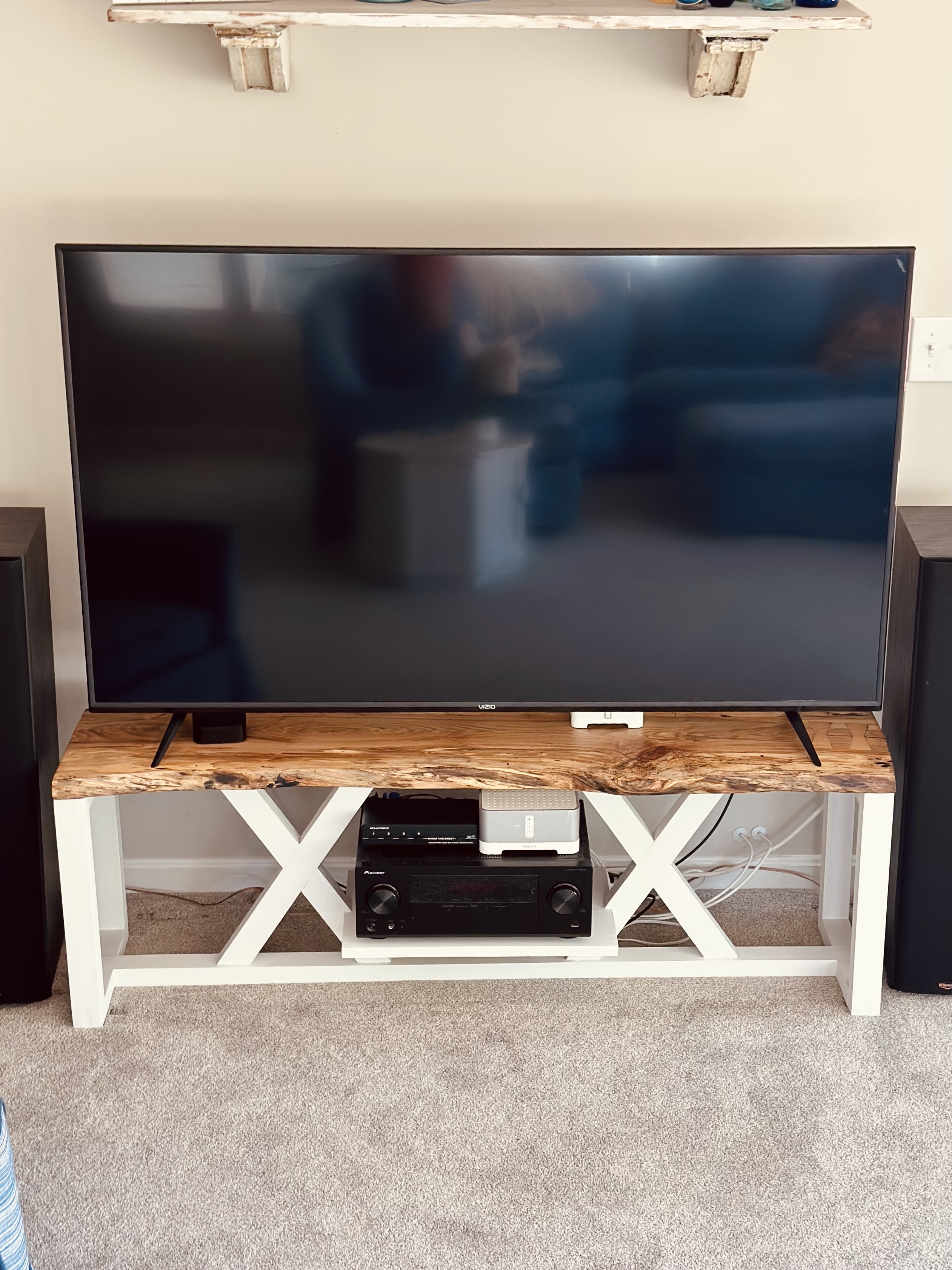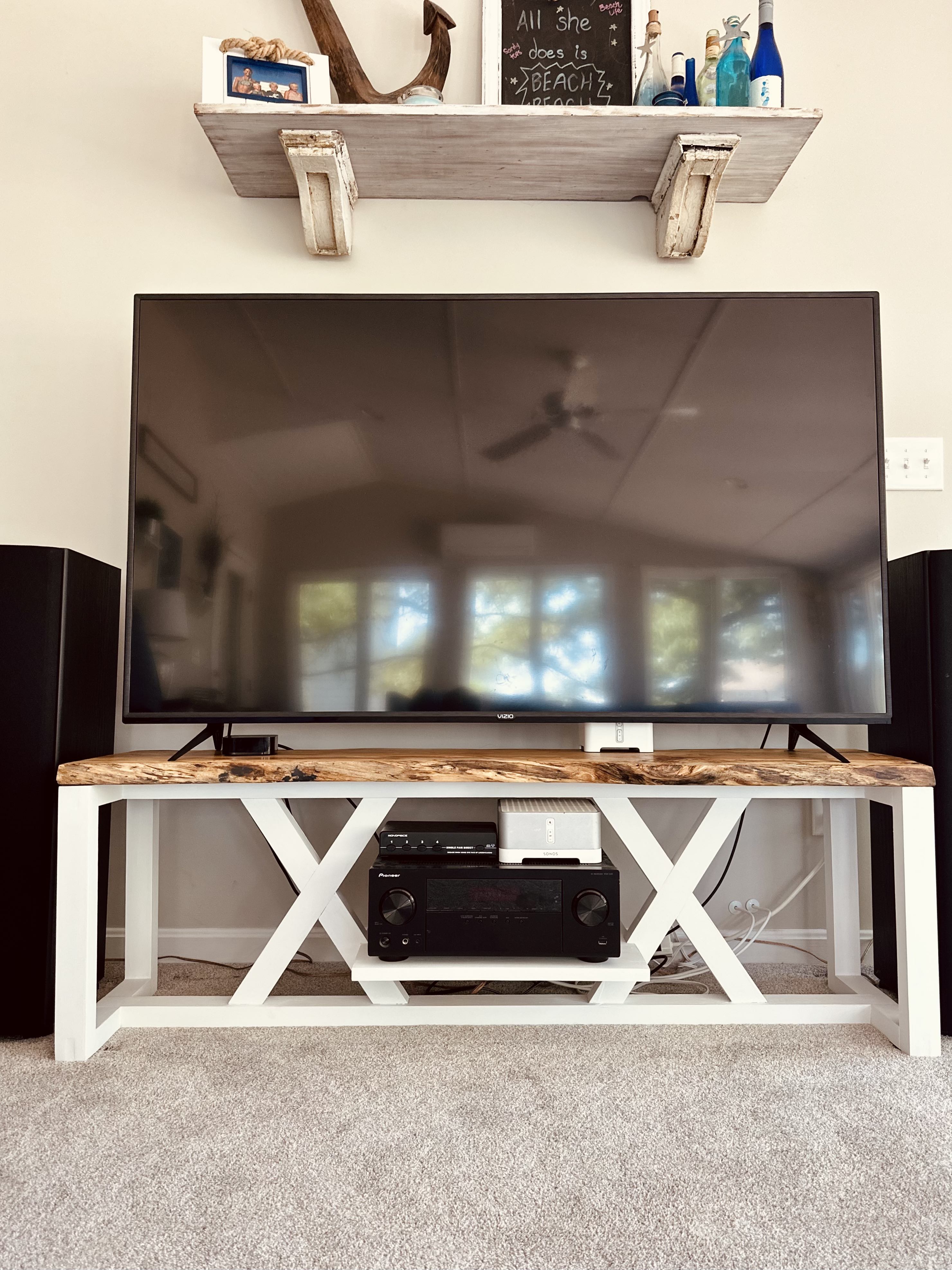 I did two, in fact! First there’s this awesome TV table, with a custom floating shelf for a receiver and equipment. Let me tell you, I noodled about getting the cuts right to make that shelf square for awhile.