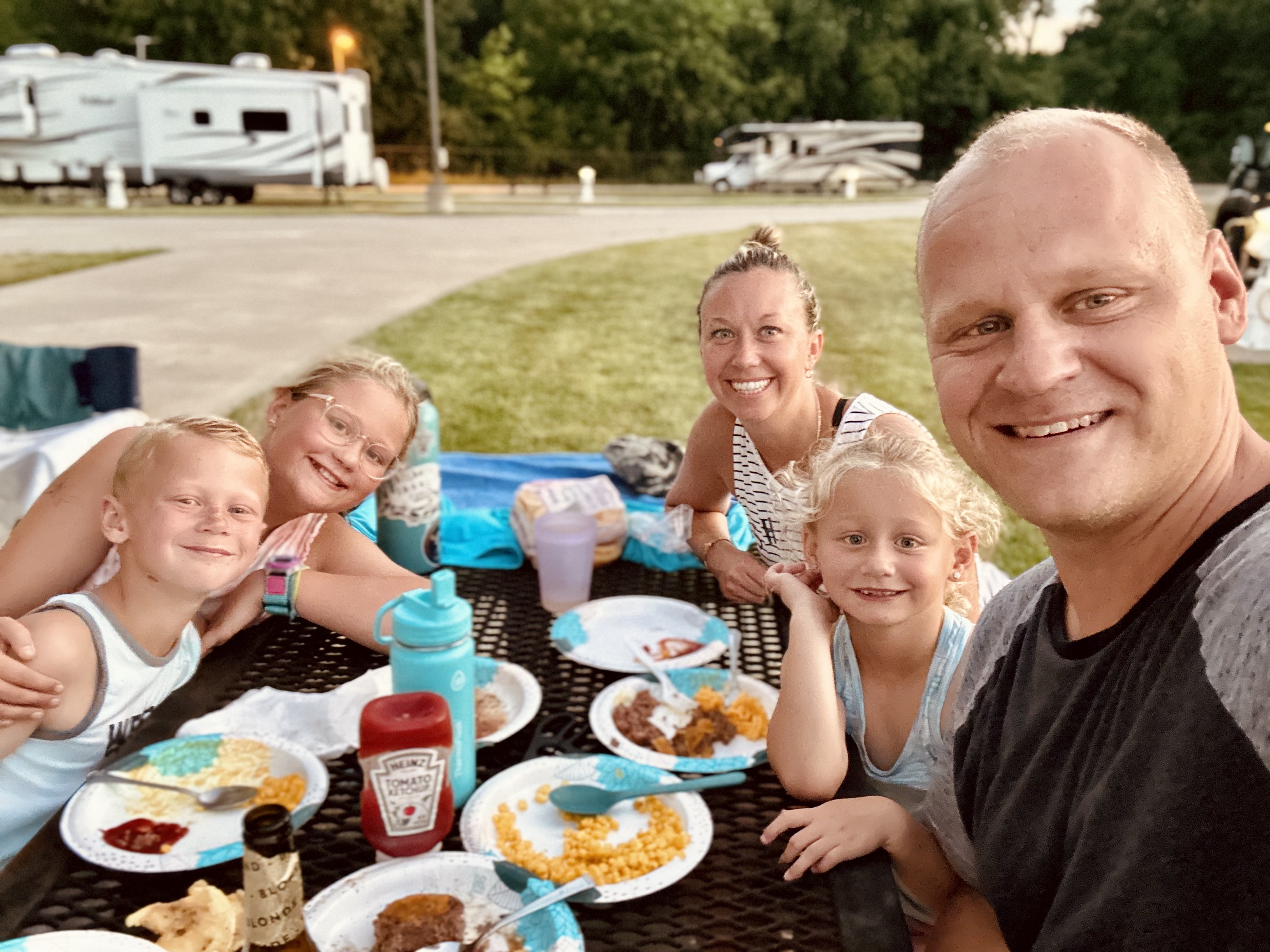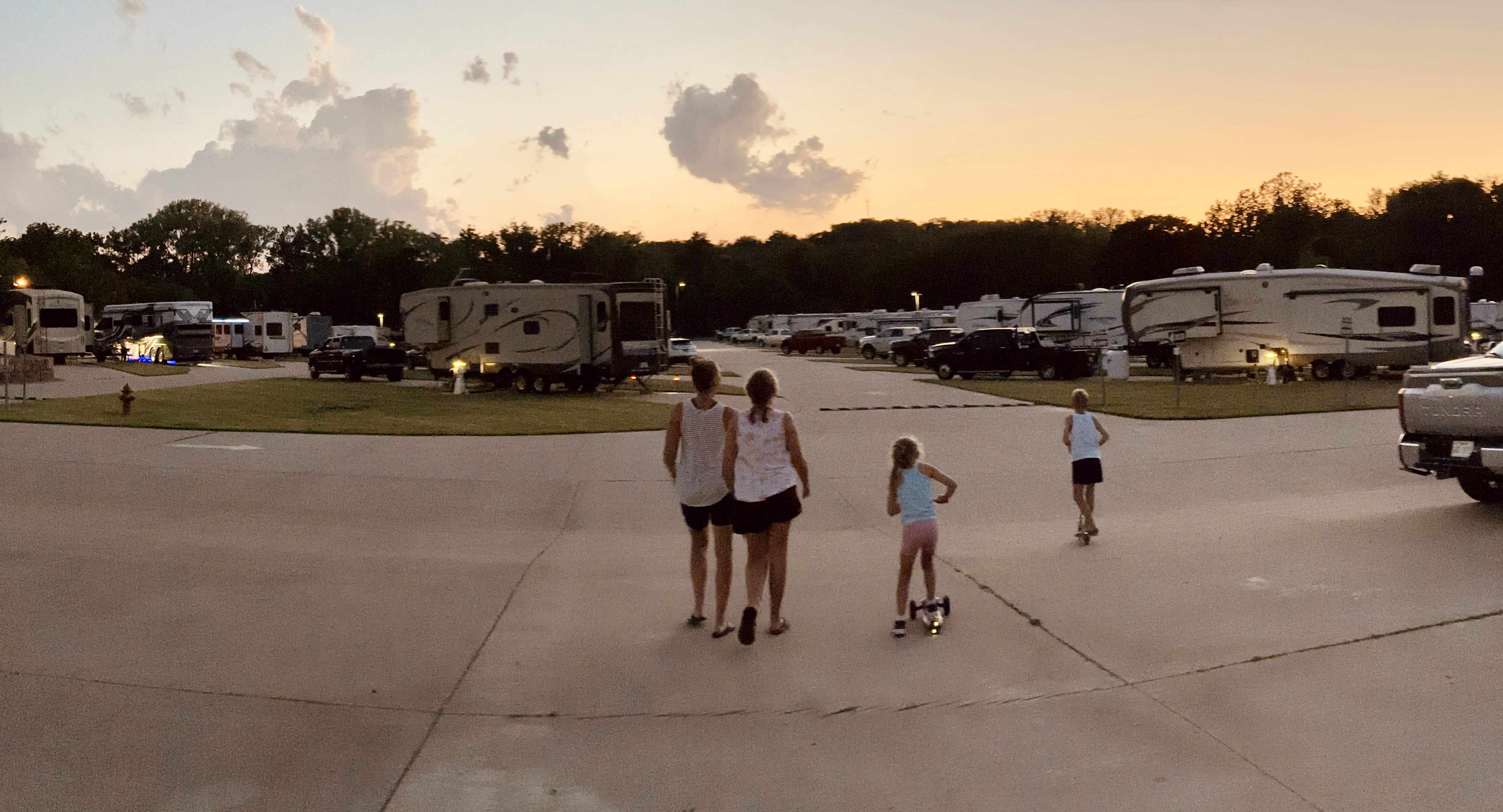 If the first RV park in Illinois was a bucolic interlude then Topeka was a concrete wasteland. This was a whole different kind of place. It was a huge expanse of concrete, perfectly manicured cuts of grass (no carpets or chairs on the grass!), restrooms that doubles as a storm shelter, about a hundred RVs already stationed and not a single soul in sight. Granted it was still almost 100 degrees but there was literally nobody. Then we started noticing the large propane tanks. I took another look at the website and noted the monthly rates. Probably a lot of longtermers. This is a subgenre of the RV community we haven’t quite figured out yet. Anyway, we found a couple of people at the pool and the kids broke out the scooters and zoomed every which way. We cooked burgers on the grill and waited for it to cool down before packing it in.
