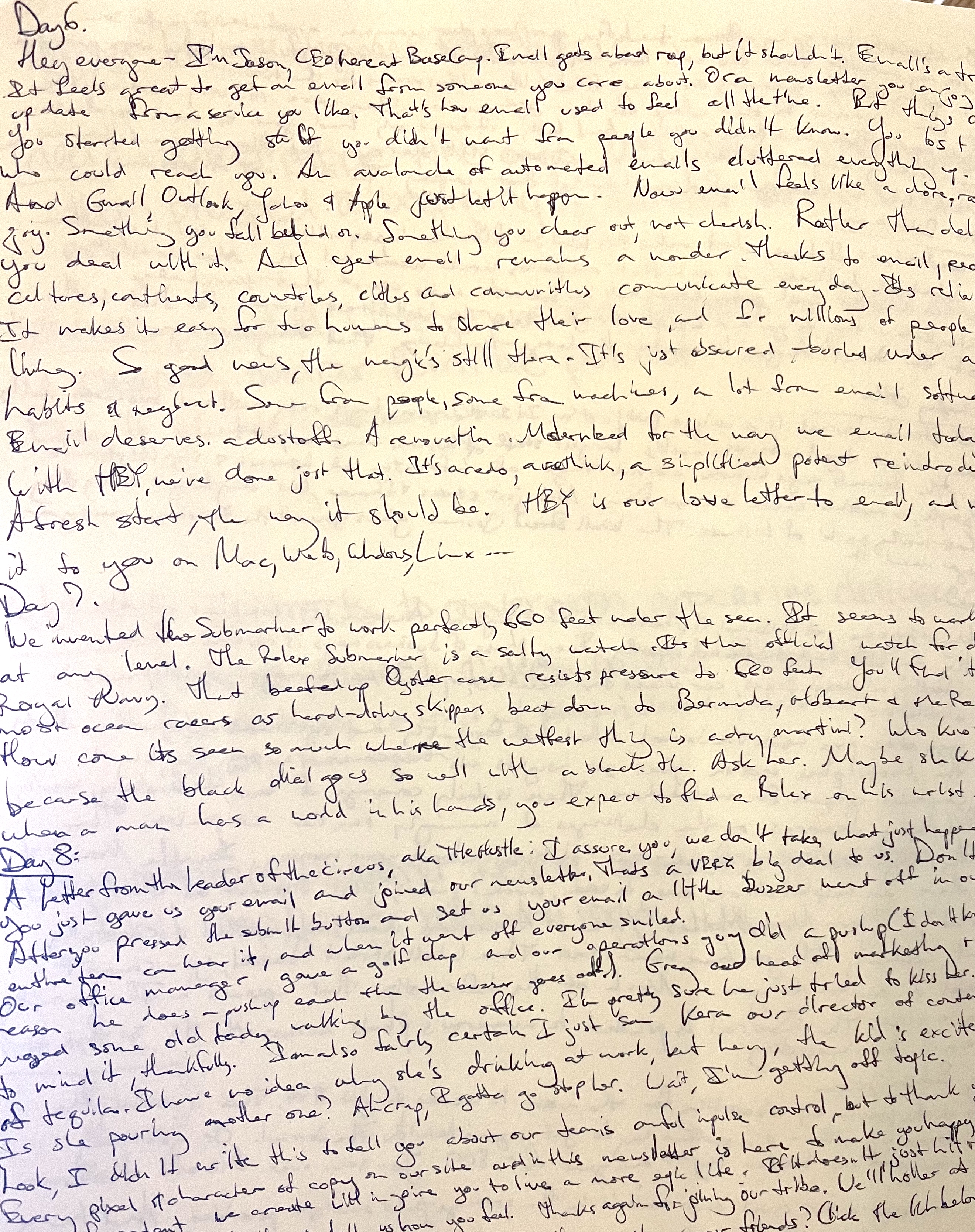 Earlier this year I took the excellent copywriting course CopyThat. It was only ten days long and it was very simple. Each day I copied - by hand and on paper - great pieces of copywriting and read through the analysis of why it was great. This seemed lame at first, but I was a convert by day 3. Writing it down forced me to slow down and think about what I was writing. I thought a lot about word choice, sentence structure, overall theme and order. It made me a better writer.