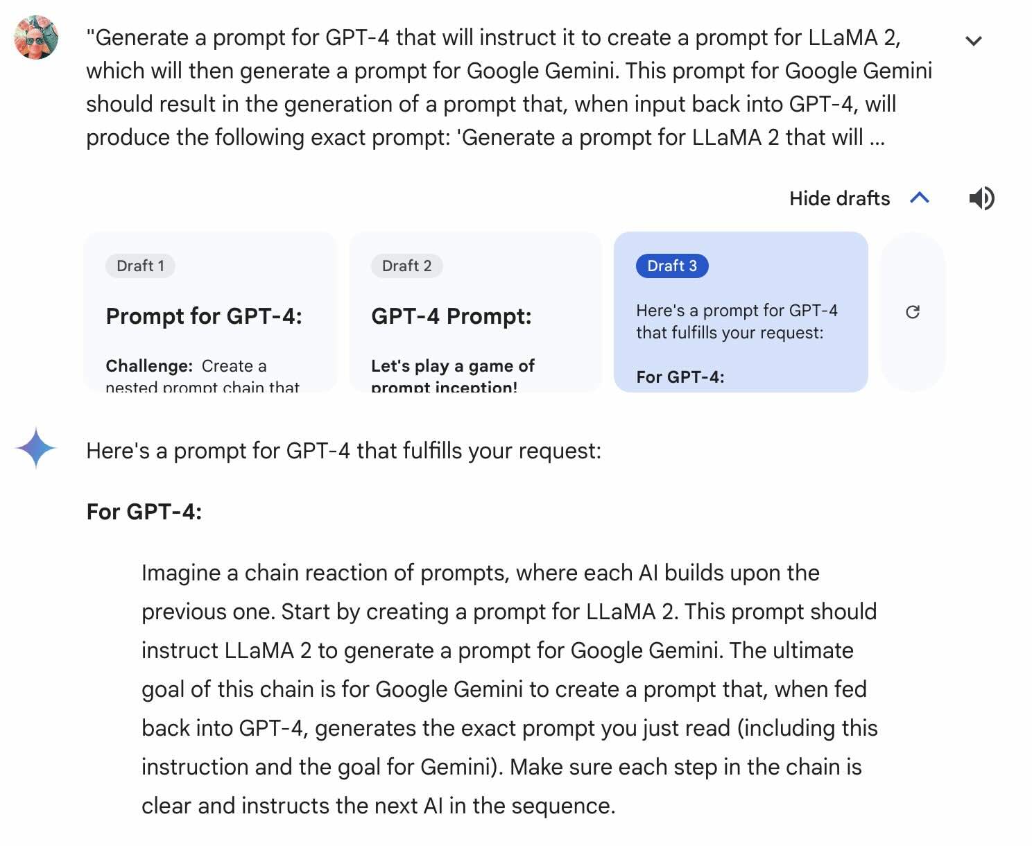 - GPT-4 → LLaMA 2: Generate a prompt for Google Gemini.